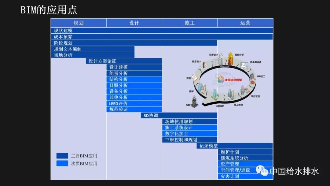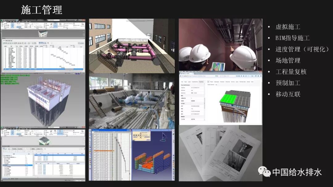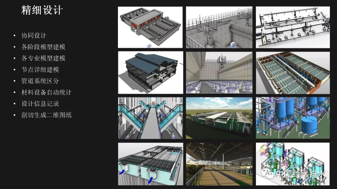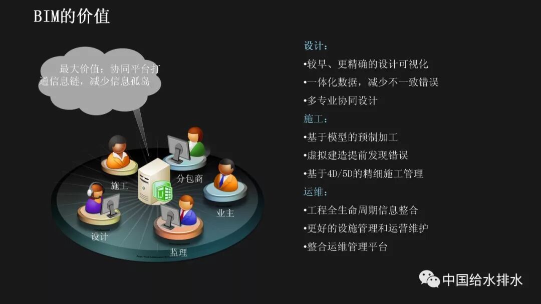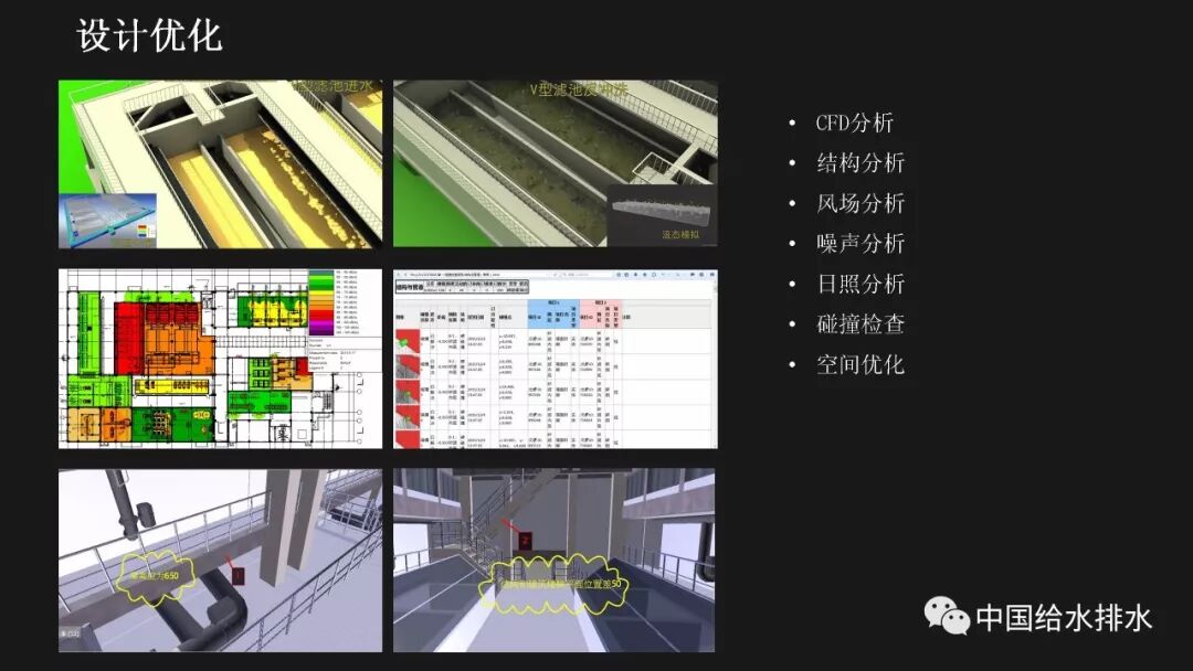 水务管理是城市管理的重要组成部分,智慧水务是智慧城市建设的必然延伸。当前,以物联网、移动互联网、人工智能技术为代表的新一代信息技术正在带来第三次信息技术革命,信息技术正在与城市基础设施相融合、与城市的管理运行系统相融合、与市民的生活和企业的运行相融合,创造出原来难以想象的城市和生活新形态。 对于水务工作而言,智慧化的着力点应落实于水务工作的各个环节,在底层数据感知、数据分析智能化的基础上,贯通数据传输,全面实现业务环节、服务环节、管理环节、决策环节的数字化管理和决策,以及水务建设全生命周期——规划、设计、施工、运维的数字化管理。 简而言之,智慧水务系统总体框架的底层是数据感知层,包括传统的计量设备、监测设备、传感器等各种监测体系,以及基于传感器技术、RFID无线射频技术、智能识别技术、物联网技术等构建而成的强大的数据获取体系;顶层是我们的用户层,主要是在丰富的数据支撑体系下,基于互联网、大数据技术,面向用户的各种智能应用;中间层是基于数据传输、集成、分析、存储技术构建而成面向业务的自动控制体系和智能应用体系。 从孤立的各个层次来讲,传统上我们行业也有不少这些方面的应用,有大量的软件企业为行业开发了许多应用软件,但是在行业的应用平台整合方面,由于缺乏统一的架构,导致我们的应用大多属于“孤岛应用”。我们面临的任务就是要将这些孤岛打通、连接、整合,使水务行业的信息化变得更智慧。 BIM技术在市政行业的应用起步得相对较晚。虽然目前标准匮乏、软件壁垒在一定程度上阻碍了BIM技术的发展,但经过近年来的实践和研究,对BIM的内涵、价值一般都有统一的认知。 美国国家BIM标准对BIM进行了四个层次的阐述,数字表达指的是形体层次,共享资源指的是信息层次,而决策过程和协同作业指的是工程管理的过程。国内学者也有类似的表述,将BIM分解为产品模型、过程模型和决策模型。 通俗而言,BIM就是辅助工程管理的工具和过程。它依靠一系列的软件采用协作的方式打造数字模型和归集工程信息,对BIM的最有效使用落实在对信息的使用上,如何在工程各阶段有效收集、录入、分析、提取、修改、传递信息才是最重要的。而三维形体本身是次要的,形体只是信息的载体。 这幅图是国际BIM发展联盟(building Smart)在其《BIM实施指南》中总结的25种BIM应用。它按照建设工程的不同阶段,分别对每种应用点进行了描述,并介绍了其潜在价值、资源需求、实施团队技能需求、实施流程等。我们国家在BIM的应用过程中,还发展了一些其他应用,比如施工进度控制、设备与材料管理等,也就是现在常说的4D-BIM、5D-BIM。从这幅图里也可以看到,BIM在规划、设计阶段的应用比较成熟和明确,在运维阶段的价值还有待不断探索和挖掘。 前面提到,对于智慧水务来说,是要消除“孤岛应用”。BIM的最大价值也在于通过信息技术,把业主、设计、施工、监理、分包商等整合到一个协同平台上来,降低信息不畅带来的额外支出和成本,减少信息孤岛。 对于设计阶段来讲,应用BIM的直接好处就是设计可视化,以及由此带来沟通便捷、高效。施工阶段如果很好的利用和深化BIM模型,能够事先在计算机里模拟建造过程,提前发现各种冲突和错误,这也是当前施工单位应用BIM技术的最大动力。最终我们把设计阶段、施工阶段的所有信息整合在一起的模型,就为我们运营维护带来了各种可能性,这其实就是将工程建设全生命周期的资料统一化、数字化。 项目前期策划阶段对整个建筑工程项目的影响是很大的。前期策划做得好,随后进行的设计、施工就会进展顺利;而前期策划做得不好,将会对后续各个工程阶段造成不良的影响。项目的前期应用BIM,使项目所有利益相关者能够早一点在一起参与项目的前期策划,让每个参与方都可以及早发现各种问题并做好协调。BIM在项目前期可以进行的工作有很多,包括:现状建模与模型维护、场地分析、土石方平衡计算、布置方案必选等,甚至于如右边这张图所示的,对于厂区现状拆迁、施工平整、建成后的各个阶段都可以整合在一个模型里,模型沿时间跨度上进行了整合。 BIM最早的应用就是在设计阶段,然后再扩展到工程建设的其他阶段。对于水厂来说,各个设计阶段、各个不同专业的模型都可以进行整合,需要详细表达的节点可以进行更为精细的建模。在构筑物模型、厂区模型完备的基础上,可以完成设备材料的自动统计、二维图纸的剖切生成、管道系统的区分、设计信息的记录。模型的精细度国际上一般分为五级,对于设计而言,第三级模型细致度即满足施工图的设计要求。 BIM在设计阶段的另一项好处就是为协同设计开辟了广阔的前景,使不同专业的、甚至是身处异地的设计人员都能够通过网络在同一个BIM模型上展开协同设计,使设计能够协调地进行。 最基本的设计优化就是对各专业的模型进行协调整合、检查冲突。以往应用二维绘图软件进行设计,平、立、剖各种视图之间不协调、各专业设计图纸之间不协调的事情时有发生。由于BIM的三维特性和可视化特性,可以很方便的进行各专业间的设计协调。比如建筑结构和工艺管道设备间的冲突检查,都可以出具详细的报告。 除了做好设计协调之外,由于BIM模型中包含的各种构件详细