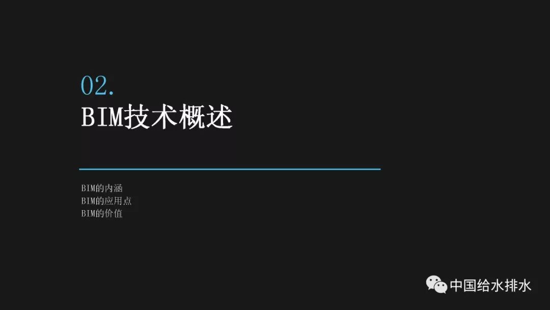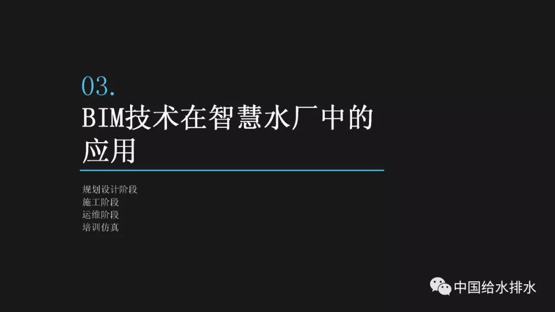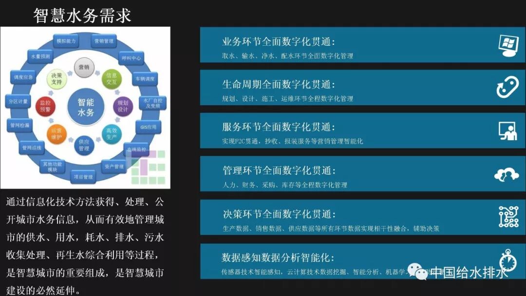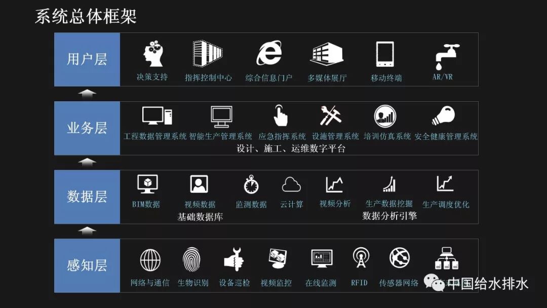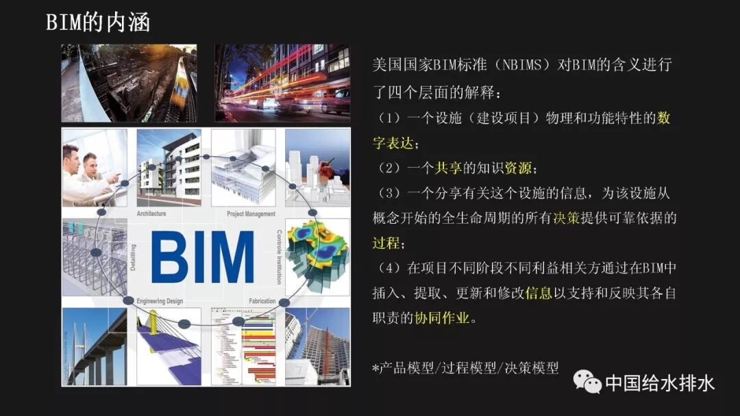 水务管理是城市管理的重要组成部分,智慧水务是智慧城市建设的必然延伸。当前,以物联网、移动互联网、人工智能技术为代表的新一代信息技术正在带来第三次信息技术革命,信息技术正在与城市基础设施相融合、与城市的管理运行系统相融合、与市民的生活和企业的运行相融合,创造出原来难以想象的城市和生活新形态。 对于水务工作而言,智慧化的着力点应落实于水务工作的各个环节,在底层数据感知、数据分析智能化的基础上,贯通数据传输,全面实现业务环节、服务环节、管理环节、决策环节的数字化管理和决策,以及水务建设全生命周期——规划、设计、施工、运维的数字化管理。 简而言之,智慧水务系统总体框架的底层是数据感知层,包括传统的计量设备、监测设备、传感器等各种监测体系,以及基于传感器技术、RFID无线射频技术、智能识别技术、物联网技术等构建而成的强大的数据获取体系;顶层是我们的用户层,主要是在丰富的数据支撑体系下,基于互联网、大数据技术,面向用户的各种智能应用;中间层是基于数据传输、集成、分析、存储技术构建而成面向业务的自动控制体系和智能应用体系。 从孤立的各个层次来讲,传统上我们行业也有不少这些方面的应用,有大量的软件企业为行业开发了许多应用软件,但是在行业的应用平台整合方面,由于缺乏统一的架构,导致我们的应用大多属于“孤岛应用”。我们面临的任务就是要将这些孤岛打通、连接、整合,使水务行业的信息化变得更智慧。 BIM技术在市政行业的应用起步得相对较晚。虽然目前标准匮乏、软件壁垒在一定程度上阻碍了BIM技术的发展,但经过近年来的实践和研究,对BIM的内涵、价值一般都有统一的认知。 美国国家BIM标准对BIM进行了四个层次的阐述,数字表达指的是形体层次,共享资源指的是信息层次,而决策过程和协同作业指的是工程管理的过程。国内学者也有类似的表述,将BIM分解为产品模型、过程模型和决策模型。 通俗而言,BIM就是辅助工程管理的工具和过程。它依靠一系列的软件采用协作的方式打造数字模型和归集工程信息,对BIM的最有效使用落实在对信息的使用上,如何在工程各阶段有效收集、录入、分析、提取、修改、传递信息才是最重要的。而三维形体本身是次要的,形体只是信息的载体。 这幅图是国际BIM发展联盟(building Smart)在其《BIM实施指南》中总结的25种BIM应用。它按照建设工程的不同阶段,分别对每种应用点进行了描述,并介绍了其潜在价值、资源需求、实施团队技能需求、实施流程等。我们国家在BIM的应用过程中,还发展了一些其他应用,比如施工进度控制、设备与材料管理等,也就是现在常说的4D-BIM、5D-BIM。从这幅图里也可以看到,BIM在规划、设计阶段的应用比较成熟和明确,在运维阶段的价值还有待不断探索和挖掘。 前面提到,对于智慧水务来说,是要消除“孤岛应用”。BIM的最大价值也在于通过信息技术,把业主、设计、施工、监理、分包商等整合到一个协同平台上来,降低信息不畅带来的额外支出和成本,减少信息孤岛。 对于设计阶段来讲,应用BIM的直接好处就是设计可视化,以及由此带来沟通便捷、高效。施工阶段如果很好的利用和深化BIM模型,能够事先在计算机里模拟建造过程,提前发现各种冲突和错误,这也是当前施工单位应用BIM技术的最大动力。最终我们把设计阶段、施工阶段的所有信息整合在一起的模型,就为我们运营维护带来了各种可能性,这其实就是将工程建设全生命周期的资料统一化、数字化。 项目前期策划阶段对整个建筑工程项目的影响是很大的。前期策划做得好,随后进行的设计、施工就会进展顺利;而前期策划做得不好,将会对后续各个工程阶段造成不良的影响。项目的前期应用BIM,使项目所有利益相关者能够早一点在一起参与项目的前期策划,让每个参与方都可以及早发现各种问题并做好协调。BIM在项目前期可以进行的工作有很多,包括:现状建模与模型维护、场地分析、土石方平衡计算、布置方案必选等,甚至于如右边这张图所示的,对于厂区现状拆迁、施工平整、建成后的各个阶段都可以整合在一个模型里,模型沿时间跨度上进行了整合。 BIM最早的应用就是在设计阶段,然后再扩展到工程建设的其他阶段。对于水厂来说,各个设计阶段、各个不同专业的模型都可以进行整合,需要详细表达的节点可以进行更为精细的建模。在构筑物模型、厂区模型完备的基础上,可以完成设备材料的自动统计、二维图纸的剖切生成、管道系统的区分、设计信息的记录。模型的精细度国际上一般分为五级,对于设计而言,第三级模型细致度即满足施工图的设计要求。 BIM在设计阶段的另一项好处就是为协同设计开辟了广阔的前景,使不同专业的、甚至是身处异地的设计人员都能够通过网络在同一个BIM模型上展开协同设计,使设计能够协调地进行。 最基本的设计优化就是对各专业的模型进行协调整合、检查冲突。以往应用二维绘图软件进行设计,平、立、剖各种视图之间不协调、各专业设计图纸之间不协调的事情时有发生。由于BIM的三维特性和可视化特性,可以很方便的进行各专业间的设计协调。比如建筑结构和工艺管道设备间的冲突检查,都可以出具详细的报告。 除了做好设计协调之外,由于BIM模型中包含的各种构件详细
