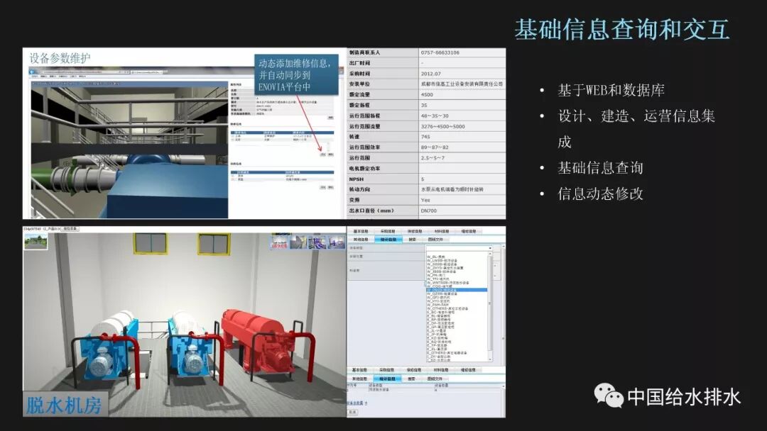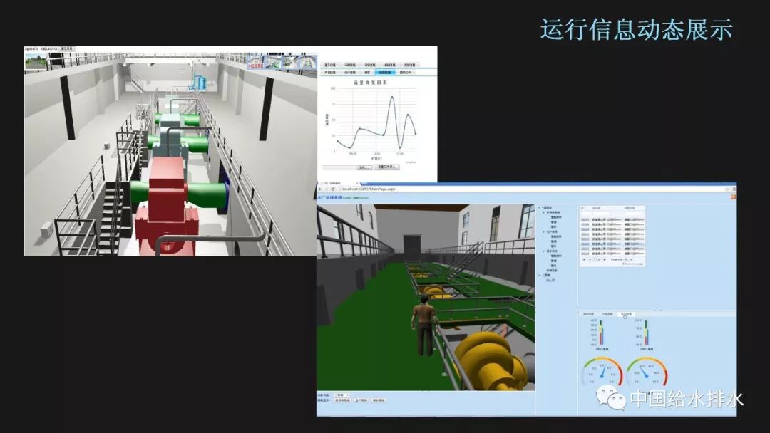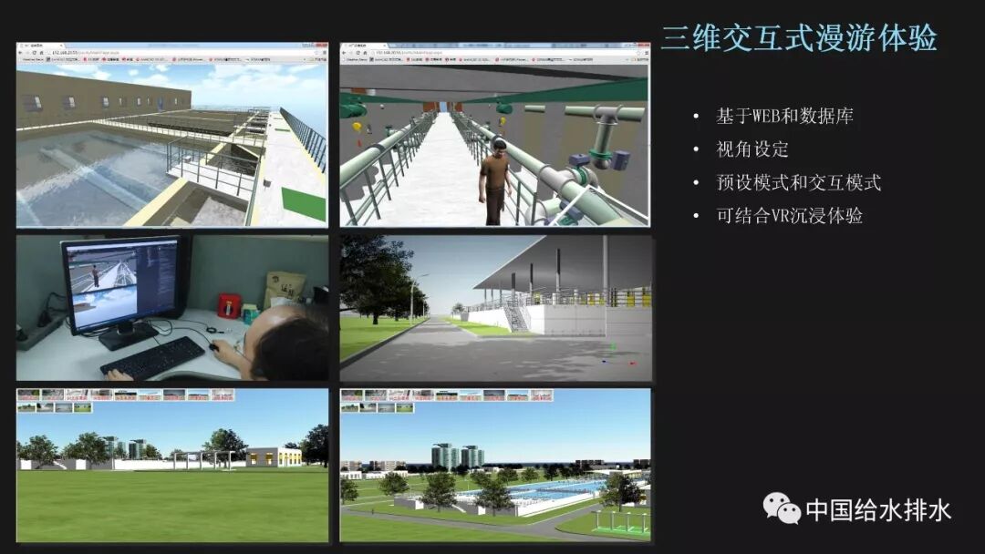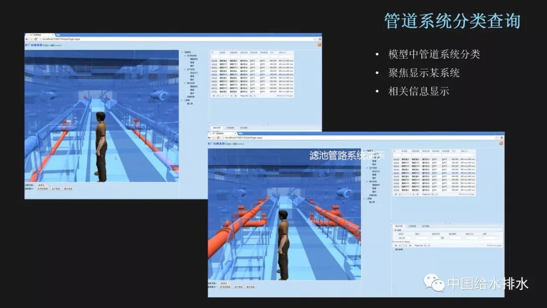 在工程项目建设中,尤其是大型项目,不确定因素很多,施工的工序搭接、进度安排,资源调度安排等等往往存在着众多矛盾,施工单位通过BIM模型可在项目施工之前预先模拟项目施工过程,提前将可能出现的问题找出并加以解决,保证项目的顺利进行,保证工期的同时也节约了返工等带来的不必要成本。因此施工企业对于应用新技术、新方法来减少错误、浪费,消除返工、延误,从而提高劳动生产率,带动利润的上升的积极性是很高的。 BIM在施工阶段可以有如下多个方面的应用:三维协调/管线综合、深化设计、场地使用规划、施工系统设计、施工进度模拟、施工组织模拟、数字化建造、施工质量与进度监控、物料跟踪等。 前面提到,BIM真正的价值在于消除信息孤岛,消除工程参与方的信息传递障碍。设计的协同建模还只是在设计院内部的协同,基于BIM工作应用流程,构建协同平台,有助于业主、设计、施工真正的在一个平台上工作,在各自的权限内对项目进度进行管理,对项目状态进行监控,对人员权限进行控制,以及对项目建设过程中的各种流程进行数字化管理。当前,基于BIM的协同管理平台很多单位都有尝试,要真正地发挥效用,需要业主单位在BIM实践中发挥主导作用。 运营阶段则是工程实体发挥功能和全生命周期中最长的阶段,这个阶段的管理工作同样非常重要。BIM服务于运维,已经发展成为一个相对独立的研究方向,BIM和设施管理相结合的研究越来越受到关注,这也正是智慧水务建设的一个重要方面,即对供水设施的运营进行科学化的管理。 BIM竣工模型能够实际反映工程实体的最终状态,以及包含全过程的信息记录,结合BIM的天然特性,发挥其三维体验、视觉化管理、信息集成交互三方面的优势,能够帮助我们开发出服务于各种目标的管理平台。这六个应用点是我院结合BIM技术开发的信息管理平台雏形,更多的应用价值有待进一步研究挖掘。 基于BIM模型开发的最直接应用就是利用其可视化特性,在管理平台中加入三维交互式的漫游体验,将工程实体场景在计算机中呈现,漫游线路也可以分为预设模式和人机交互模式。由于是基于网页和数据库,这种应用为工程实体展示、上岗培训、以及后续的各种应用提供了技术基础。 既然BIM模型包含了完整的设计、建造和运营信息,那么我们就可以按需对设备、管道等的基础资料进行查询,比如选中三维视图中的某个阀门,平台自动检索出该阀门的生产厂家、安装时间、备品备件等信息;同时我们可以对设备的信息进行更改和更新,比如增加一条检修记录,数据库会自动同步,保证平台信息的即时性和有效性。