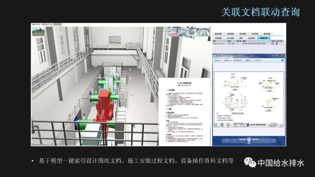 除了基本的设备信息之外,还可以将设计、施工、安装过程中相关技术文档与工程实体关联,让相关的信息和资料都通过三维模型建立联系,避免工程资料的分散存储、查找不便。如图对某台水泵可一键索引其水泵基础设计图、水泵安装技术文档等。从某种程度上讲,这才是达成了将工程所有信息集成在一起的目的。